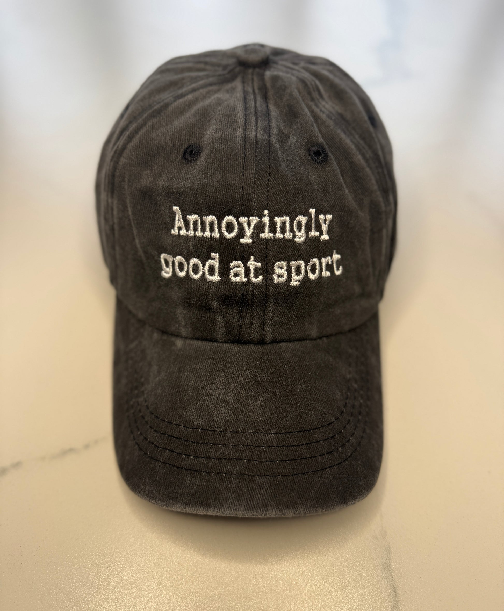 This Bestie Bundle includes 1 “No Good At Sport” washed charcoal cap with white text and 1 “Annoyingly Good At Sport” washed charcoal cal with white text.