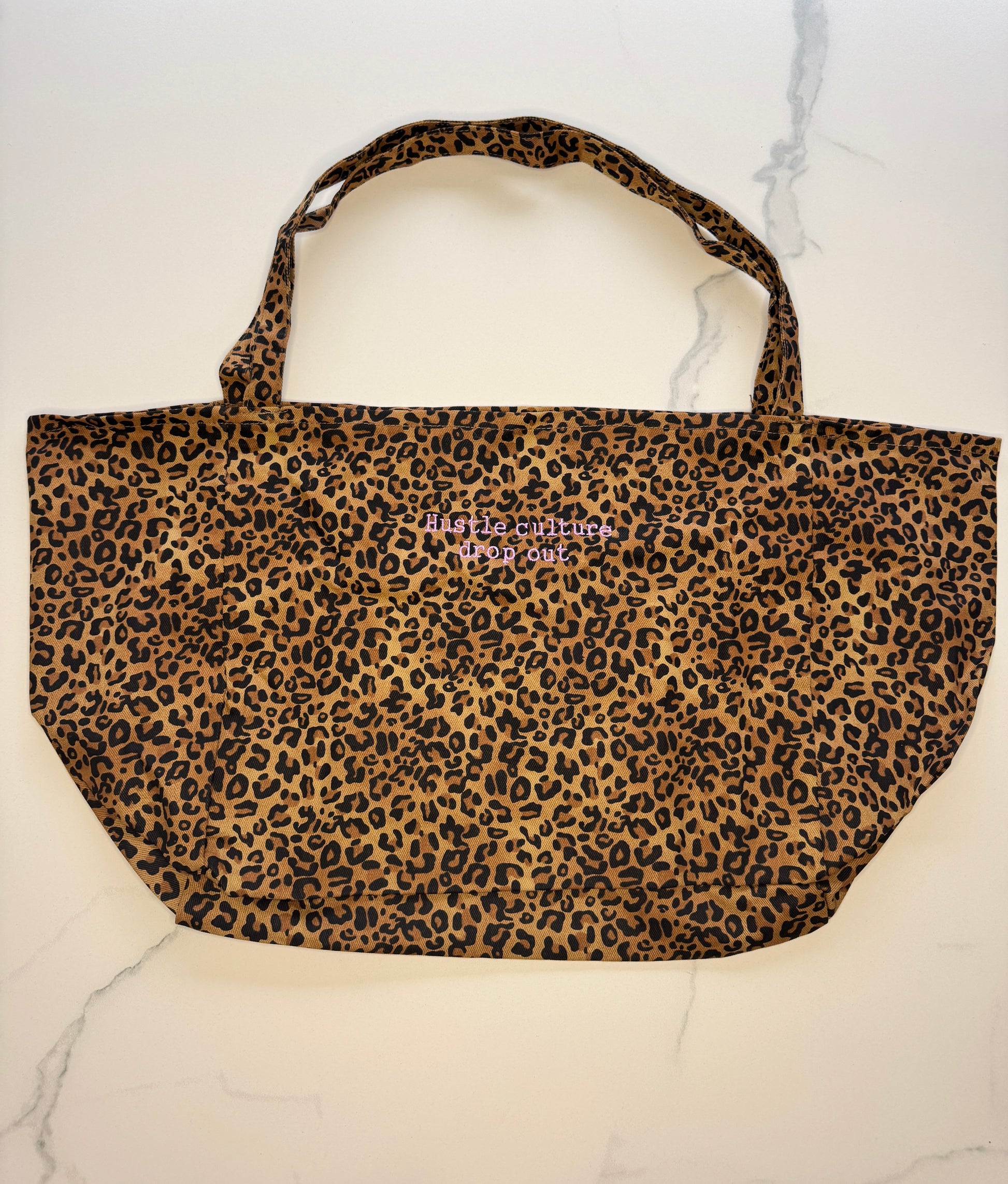 Hustle Culture Drop Out XL tote bag, in leopard print with lilac text.